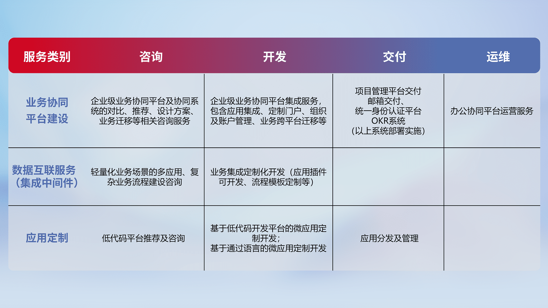 针对钉钉、、、、企微、、、、IDaas等平台级产品提供产品的规划、、、方案、、交付、、定制化开发等服务,,,,实现如统一协同办公、、、、智能客户服务、、、混合会议管理、、智能数据查询、、、等业务场景,,实现数字化转型。。